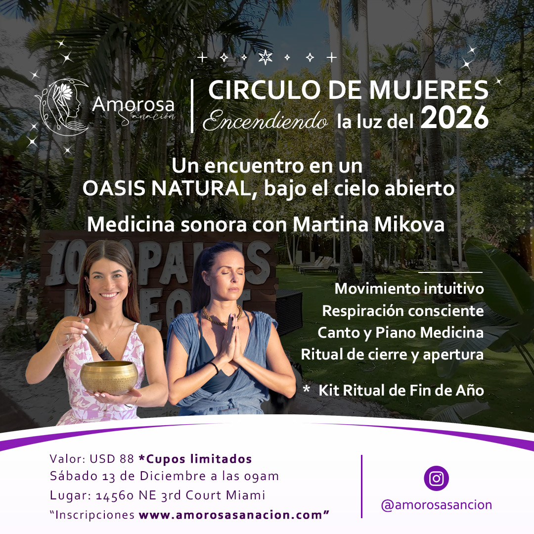 Su voz y su piano medicina sostendrán el círculo con una intención cálida, amorosa y expansiva, guiando el tránsito entre cierre y renacimiento.